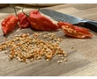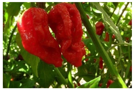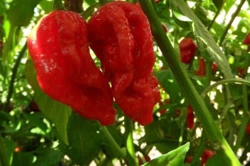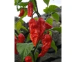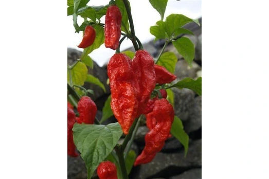 The waxy skin is red and wrinkled. This small, but extremely hot pepper scores 10 out of 10 in terms of hotness. Plant growth starts out slow, but eventually makes tall plants that could be almost 1.5 meters (in good locations). The thin-walled, wrinkled, pointed fruits reach a length of 5-6 cm, usually ripening to red.